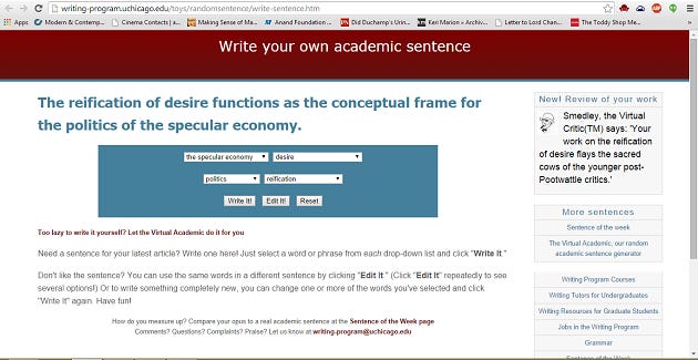 Are you in the field of academia? Do you worry about not sounding academic enough in your papers and your discussions? Do you scratch your head every time someone talks about discourses or normative values or the pedagogical institutions? Can you not make your mind about structures and whether or not you are capable of breaking the ones that surround you? Can you not identify those structures? Worry not. Your one shop stop for all your academic vocabulary is just a click away. The University of Chicago has developed an app that helps you construct academic sounding sentences. All you need to do is select options from the dropdown menus and hit ‘write it!’ If you do not like the sentence there’s an edit option available too. For example, I never thought I’d be able to construct a sentence like this one: ‘The reification of desire functions as the conceptual frame for the politics of the specular economy.’ But now I can! I may or may not know what it means. But I don’t care; so long as I can sound academic the world can go fuck itself.